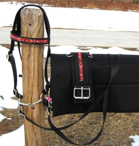 It's hard to find this kind of quality in this size, at this price. Nylon brow band complete bridle with undropable rein and 3.5" bit. Matching overlay. 15" double buckle felt cinch. 22" felt covered, compressed foam blanket/pad. Great padding without the bulk. Specifically built for our smaller equines. MADE IN THE USA Bridle measures 32" from bit attachment, around ears, to other side, at largest setting. 25" at smallest. One-point adjustment. This set generally considered a good fit for small ponies and miniature horses under 44". Please measure the total skirt length of your saddle to make sure pad is longer than your saddle. Please contact us if you need a longer pad. Complete bridle, with bit, rein and headstall. Want a matching breast collar? Add . Drop us an email, we'll send you an invoice.